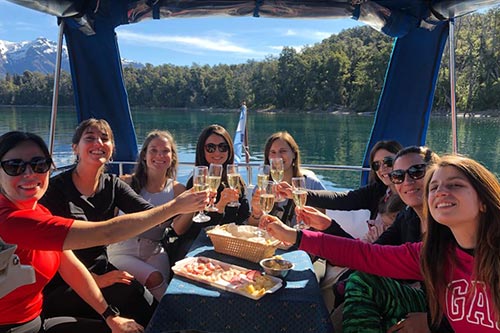 Cruzamos el brazo Angostura hasta llegar al muelle de Arrayanes, buscando llegar en sus momentos de mayor tranquilidad. Desembarcamos en el muelle del bosque para que los pasajeros den inicio al recorrido. La caminata en el bosque se hace a través de una pasarela circular de 800 mts. Una vez finalizada, volvemos a embarcar para dirigirnos a una bahía del lago donde el barco detiene su marcha. Es momento de contemplar el entorno y la calma del lago, y que mejor que hacerlo invitando a los pasajeros con un brindis, una cerveza o una copa de vino.